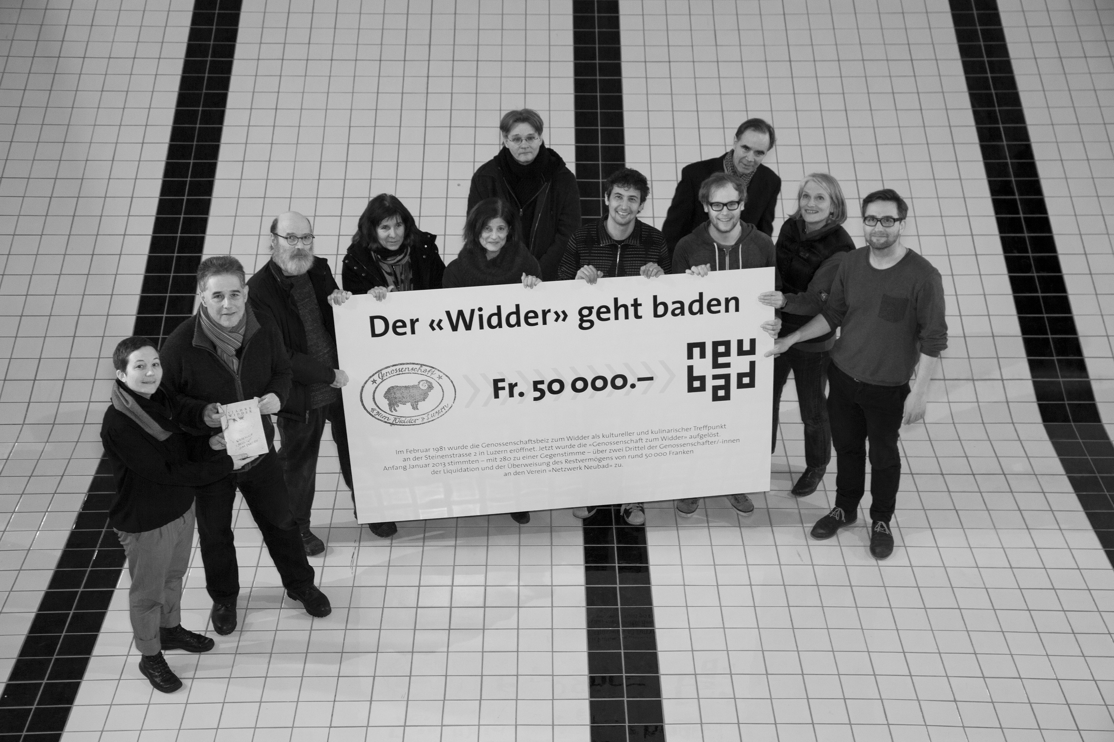 Die Generalversammlung der Genossenschaft zum Widder hat Anfang Januar 2013 mit 280 zu einer Stimme entschieden, die Genossenschaft aufzulösen und das noch vorhandene Vermögen dem Verein Netzwerk Neubad zu überweisen. Somit geht der "Widder" baden und überreicht den Initianten der Zwischennutzung des früheren Luzerner Hallenbades einen Check in der Höhe von 50'000 Franken.