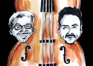 Wenn Pino Dietiker und Matthias Abächerli gemeinsam auftreten, bilden sie ein Trio: Hier der Sprachmensch, dort der Bassist, und zwischen den beiden steht eine Frau mit Rundungen aus Fichtenholz und Haarsträhnen aus Schafsdärmen, die der eine mit schönen Worten, der andere mit schnellen Fingern umwirbt. Und mag das Balzverhalten der zwei Werbenden die Holzdame auch kaltlassen - das Publikum bringt es in Wallung.