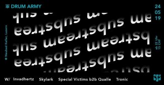 Das Drum&Bass Record Label Drum Army präsentiert die altbekannte Veranstaltungsserie Substream in einer neuen Location. Im Neubad erzittert am 24.05.2019 zum ersten mal der Boden wenn gleich mehrere internationale Gäste, supported von den Drum Army DJs, die Bässe beben lassen.