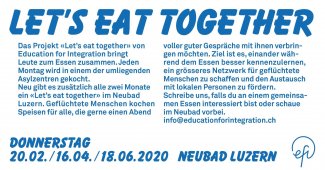 DU kannst uns einladen, wir dich, oder du hilfst Abendessen zu organisieren. Das Ziel ist einander während dem Essen besser kennenzulernen, Geschichten zu erzählen, ein grösseres Netzwerk für geflüchtete Menschen zu schaffen und den Austausch mit lokalen Personen zu fördern. Neu gibt es alle zwei Monate ein «Let‘s eat together» im Neubad Luzern. Geflüchtete Menschen kochen ihre Speisen für alle die gerne einen Abend voller guter Gespräche mit ihnen verbringen möchten.
