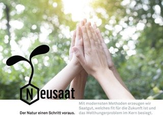 »Die Natur befindet sich im stetigem Wandel und stellt die Menschheit immer wieder vor neue Herausforderungen. Neusaat hat sich einer dieser angenommen. Mit modernsten Methoden erzeugen wir Saatgut, welches fit für die Zukunft ist und das Welthungerproblem im Kern besiegt.« Neusaat - Der Natur einen Schritt voraus