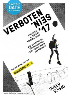 «VERBOTEN SEIN: Gibt es Hoffnung geflüchtete LGBTI*-Menschen in der Schweiz?» ist die vierte thematische Schwerpunkt-Veranstaltung, die von Queer Office zu LGBTI Themen präsentiert wird. Mit Hilfe der Partnerorganisation QUEERAMNESTY.CH wird das Winterfest 2017 umgesetzt.